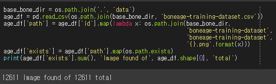 현재 해당 프로젝트에는 'csv'파일과 'Image'파일이 주어진다. csv파일에는 각 x-ray 이미지에 대한 'id', 'boneage', 'male' 이 적혀있다. 그래서, 엑셀에 정리된 자료와, 실제 이미지 데이터를 비교해가면서 결측값이 있는지 확인하는 작업이다. 그리고 그 경로와 결측값인 'path'와 'exists'들을 dataframe에 적용시켜둔다.