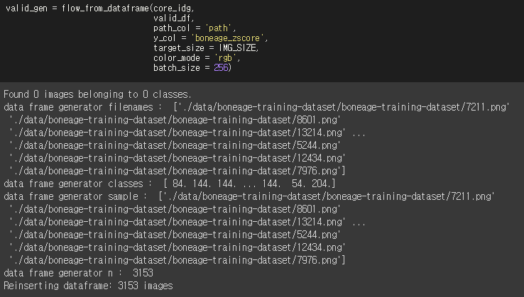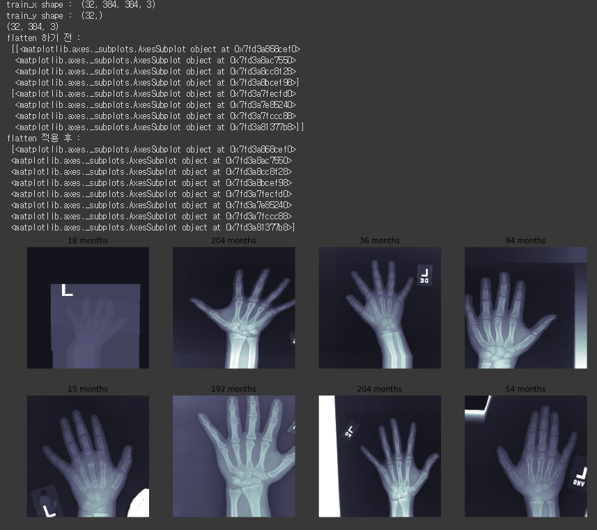 여기까지가, x-ray image data의 id, 뼈나이, 성별 등과 같은 정보를 가지고 있는 csv파일과 실제 이미지 데이터를 비교해서 빠진 부분이 없는지(결측값)을 확인하고 모델을 훈련하기 전 train dataset, validation data set, test dataset을 나누고 의료영상 데이터가 턱 없이 부족하니, ImageDataGenerator를 거쳐서 Data Augumentation(데이터 증식)을 하는 과정이다.