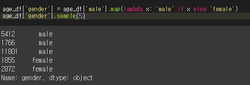 - 'male' if x 라는 문법에 의거해서 x의 값이 True이면 'male'이 되는것이고, 그것이 아니라면(else) 'female'로 되어서 age_df['gender']에 기록이 되는것이다.