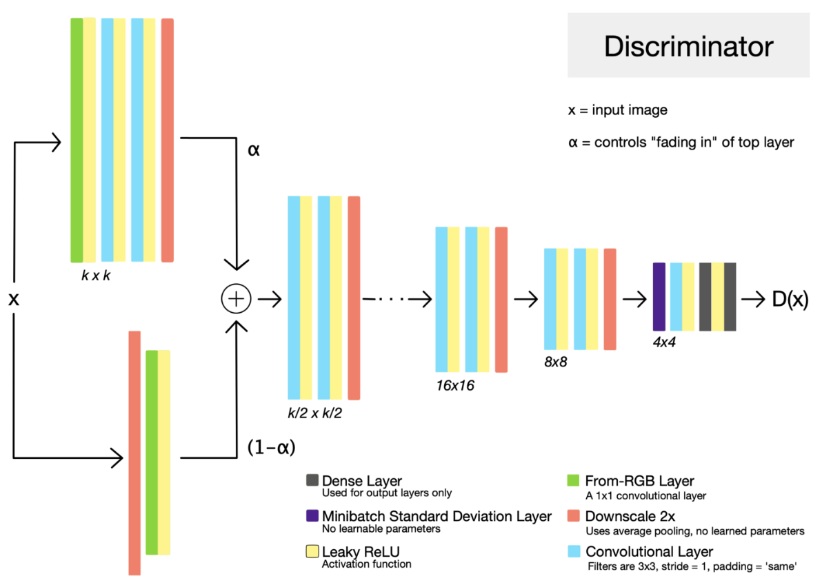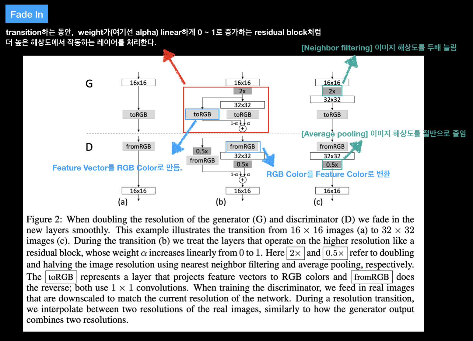 transition하는 동안(G에서는 Up Scaling, D에서는 Down Scaling) weight(=alpha)가 linear하게 0 ~ 1로 증가하는 residual block처럼 안정화 하기 위해서 alpha값에 의해 제어가 된다.따라서 새로운 layer가 완전히 학습이 안정적으로 될 때 까지 linear하게 0 ~ 1 사이의 값으로 증가하게 된다.