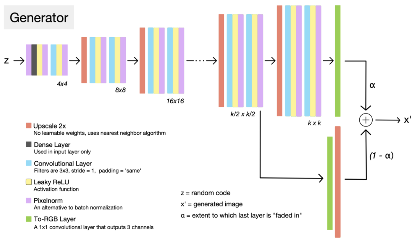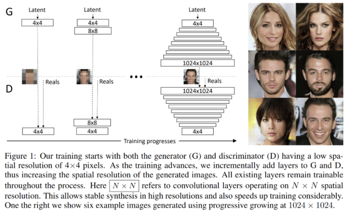 이 논문에서 제안하는 Key Point는 점진적으로 Generator와 Discriminator를 키우는 것이 핵심 포인트이다. Low resolution 에서 High resoliution으로 키우기 위해서 layer를 점진적으로 add해주는 것이다. 이렇게 점진적으로 layer를 추가해서 학습을 해주는 과정을 통해서 점점 High Resolution image를 만들어내게 된다.(해당 논문에서는 이와 같은 방법으로 1024x1024 image를 generator했다고 나와있다.)