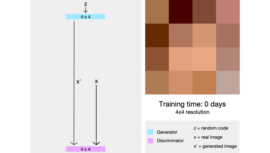 Network의 현재 해상도에 맞춰서 real images(우리가 가지고 있는 training data)를 Downscaling 하여 넣어준다. 그러면 저해상도 이미지로 변경이 되긴 하지만, 고해상도 이미지에 대한 정보를 담고 있다.