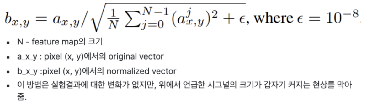 그렇다면 여기선 어떤 Normalization을 사용했는지 궁금해질텐데 바로 아래에 정리되어있는 Pixelwise feature vector normalization 을 이용해서 escalation of signal magnitudes 문제를 해결햇다.