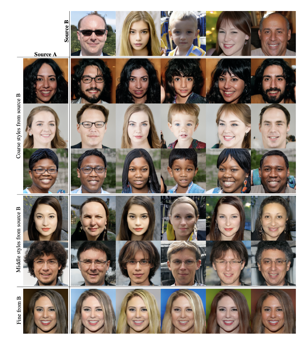이런 식으로 style이 교체되는 layer를 매번 random하게 w의 값을 적용해주는것이 인접한 두 layer간의 style correlate 되는 현상을 방지할 수 있다. 이런 식으로 학습되어진 Generator model은 각 layer가 담당하는 style이 correlate현상 없이 뚜렷하게 구분되어지는 것을 그림 4와 같이 확인할 수 있다.