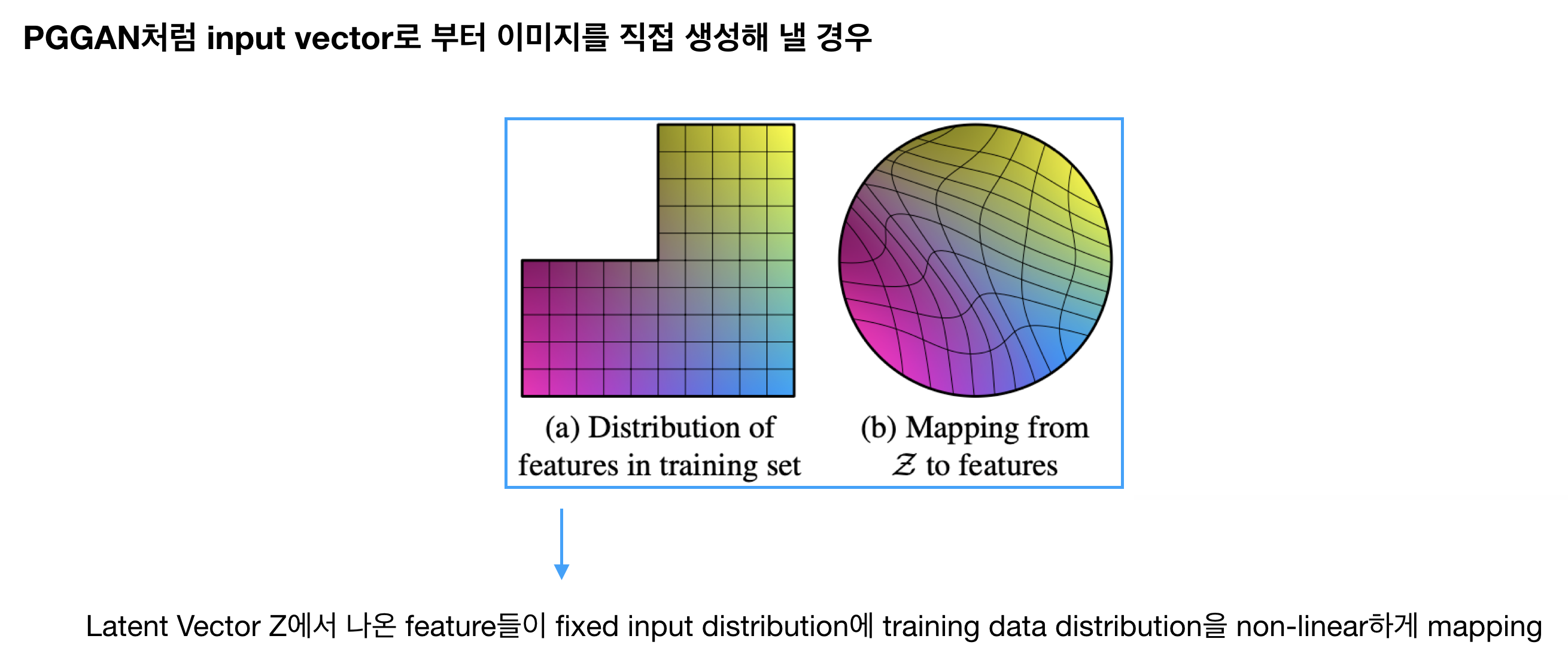 이런식으로 latent vector가 바로 input으로 들어가게 되면, latent space는 반드시 training data의 probability density를 따라야 한다. training data의 분포에 완전 관여를 하고있어서 머리카락 길이만 변경 한다던지, 사람의 시선을 변경한다던지가 많이 제한적이다. 이는 Generator model이 학습을 하는 동안 latent space가 entanglement하게 만들어지게 된다.