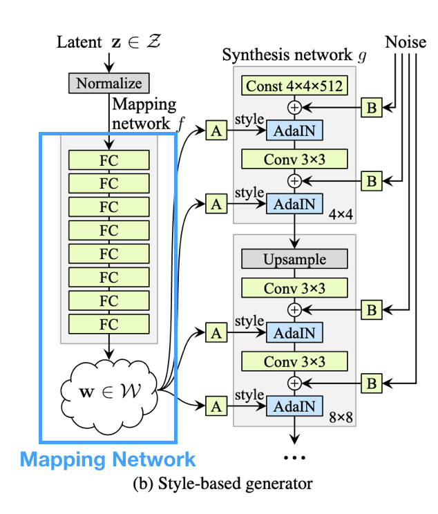 latent vector z -> Normalization -> mapping network ( Fully-Connected layer 8개로 구성) -> w를 뽑아냄.