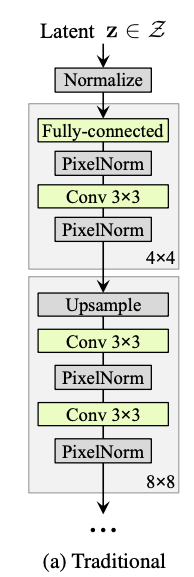 StyleGAN의 base model이 되는 모델로써, Latent vector Z가 Normalization을 거쳐 모델에 바로 input value로 들어게 된다.