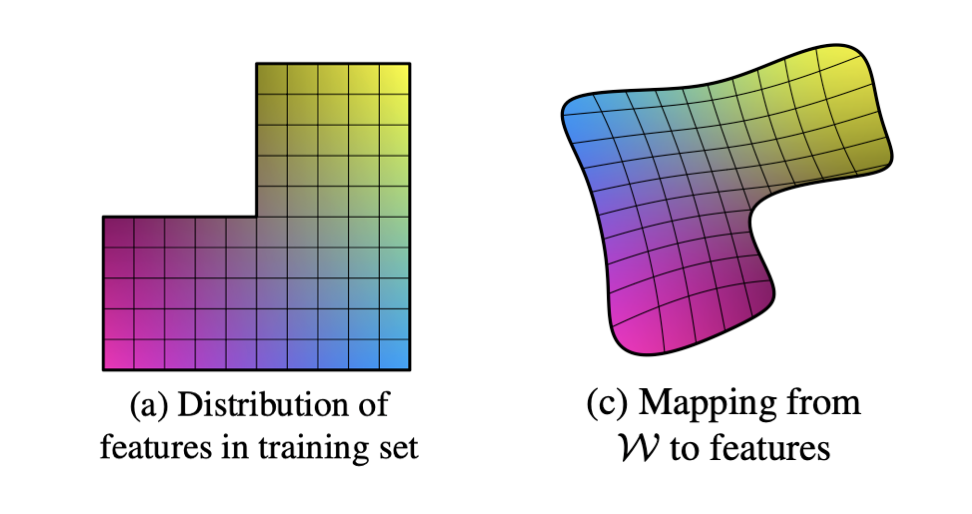 (그림 5)에서 (a)는 training data의 distribution이다. 이를 기존 방법대로 latent vector로 부터 랜덤하게 입력으로 넣어주어서 이미지를 직접적으로 생성을 한다면, training data가 fixed distribution인 latent space에 non-linear하게 mapping이 되버린다. 그렇게 되버리면 우리 학습 데이터에 검정 머리를 가진 사람들이 대부분이라고 하면, latent space에는 거의 대부분이 검정색 머리를 표현하게 되버려서 latent vector를 조절해서 머리카락 색을 변경하기가 어려워 진다.