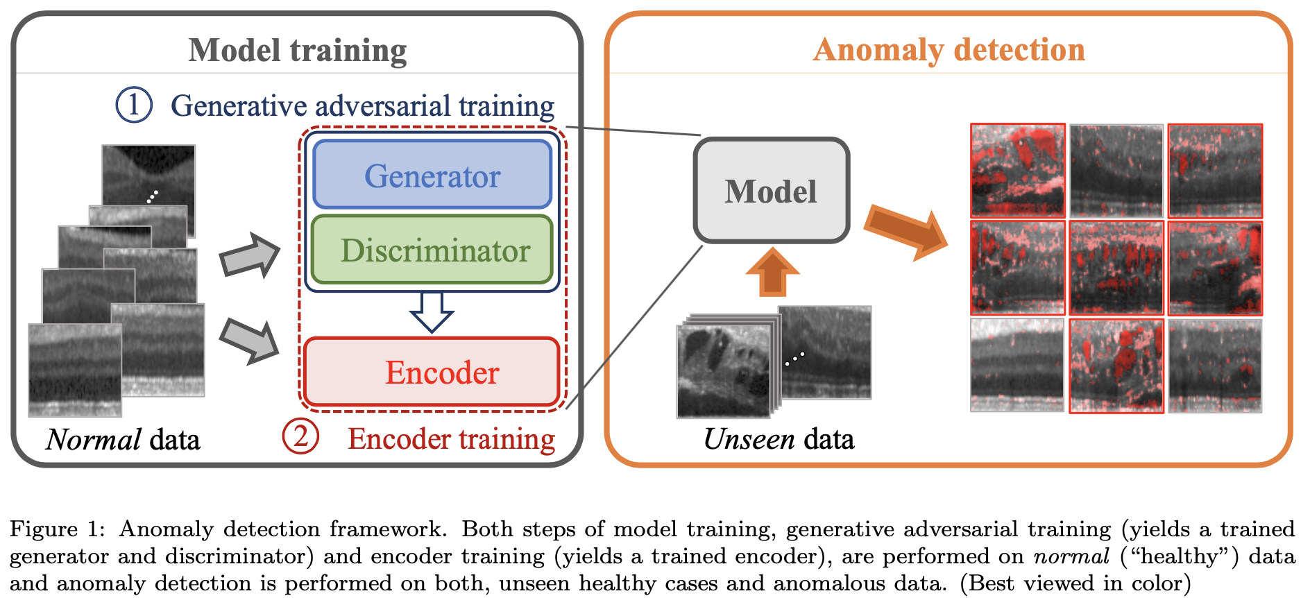 Normal data로 Generator model을 학습 시키고 GAN의 latent space에서 query data(병변 유뮤를 확인하고 싶은 영상)의 fast mapping technique를 제안하고 평가한다. latent space mapping 방법은 Encoder를 기반으로 이루어지며, Discriminator feature residual error 및 image reconstruction error G(z)를 포함하는 훈련된 모델을 기반으로 anomaly score를 통해 anomaly detection이 진행된다.