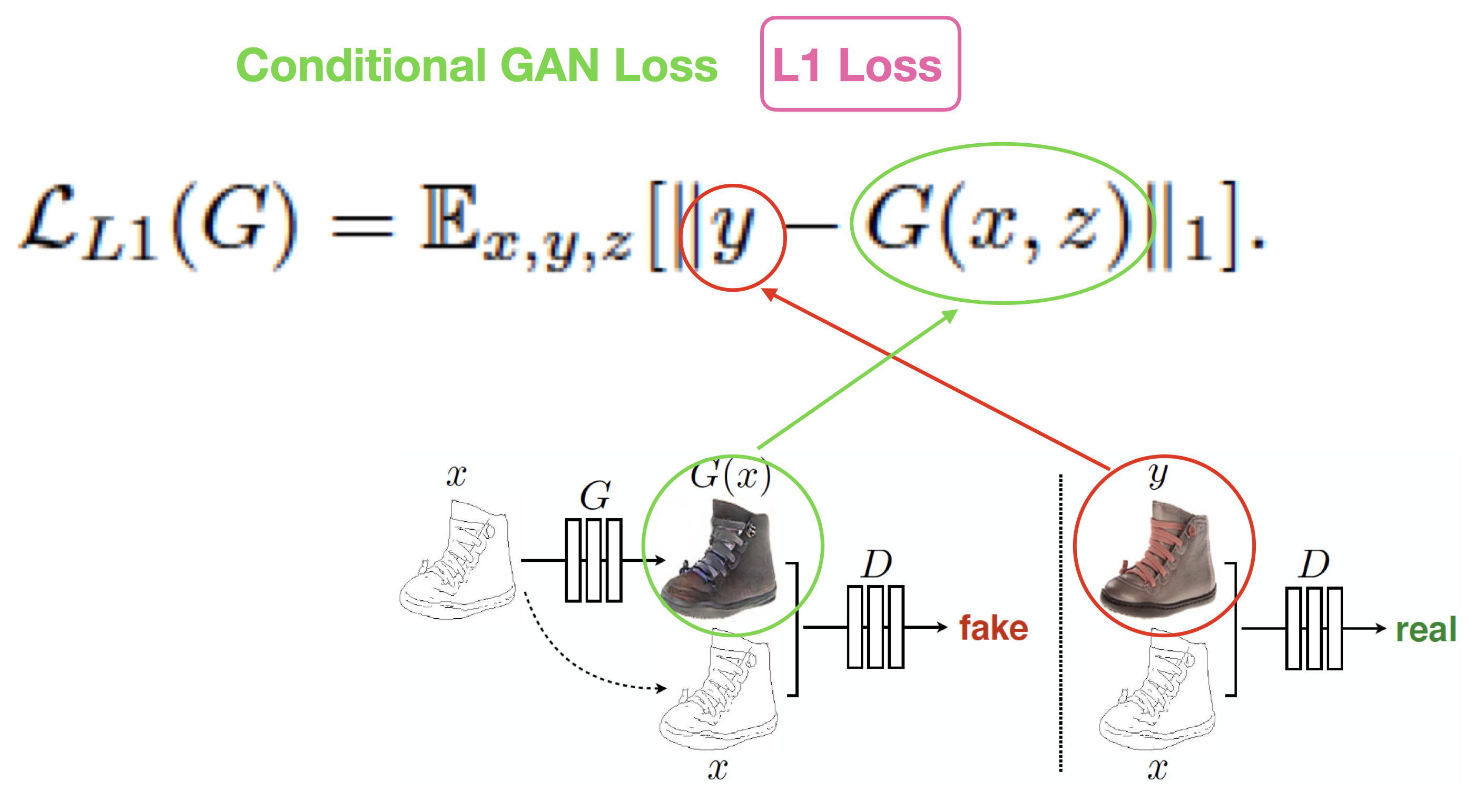 따라서 해당 저자는 사람이 봐도 진짜와 가짜가 확연히 구별이 가능한데 사람이 할 수 있다면 딥러닝 모델도 할 수 있어야 하는거가 아닌가? 라는 아이디어로 단순 Pixel Level에서 이미지의 차이만을 Loss로 가졌다면, GAN Loss를 추가해서 사용한게 바로 Pix2Pix 모델입니다. (자세한 내용을 아래에서 추가로 정리를 해보도록 하겠습니다.)