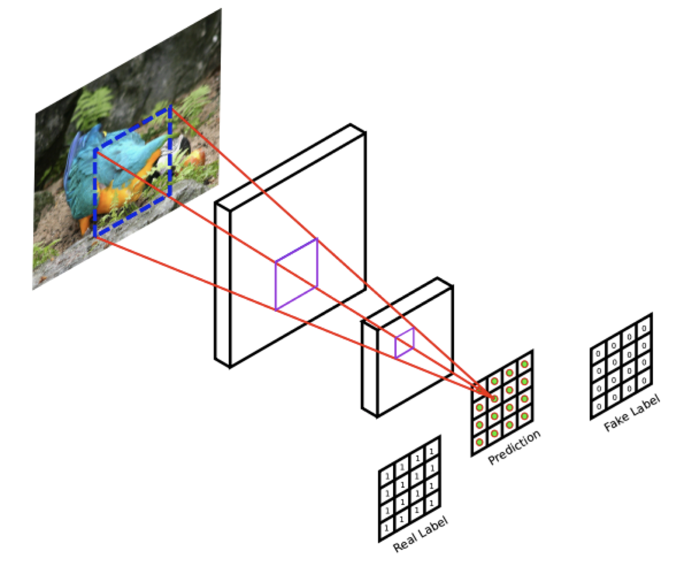 이미지 전체에서 Receptive field 크기 만큼 특정 Patch(receptive field) 부분을 보고 그 부분이 진짜인지 가짜인지 판별 합니다..