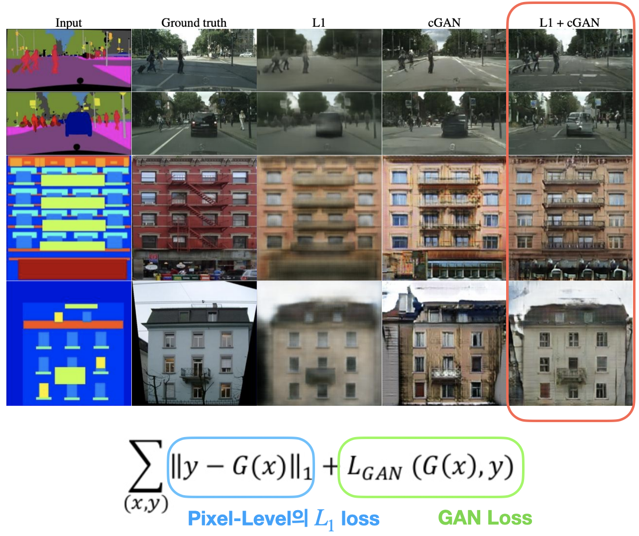 그래서 최종적으로 (그림 4)와 같이 L1 loss와 Conditional GAN Loss (CGAN Loss)를 함께 사용해야지 퀄리티 좋은 이미지를 얻을 수 있게 됩니다.