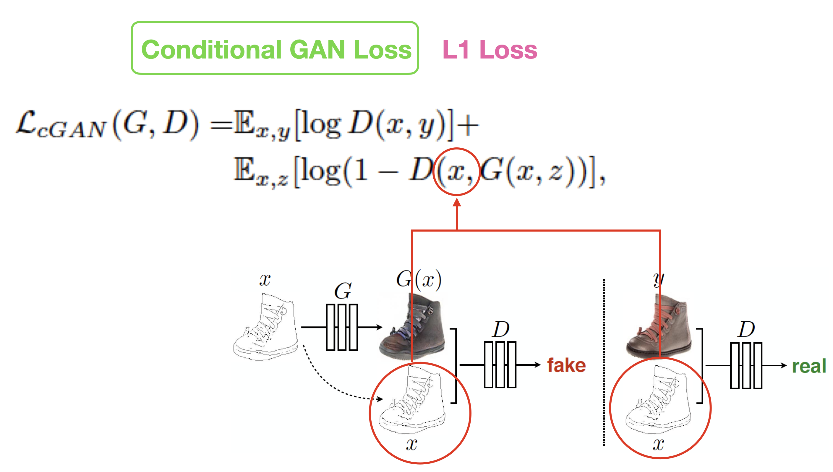 특이한점은 Discriminator의 입력 이미지에 생성된 G(x) 이미지와 training data인 x를 넣어줍니다. 이는 Conditional 효과를 줘서 GAN이 학습을 할 때 방향성을 잡아주는 역할을 합니다.