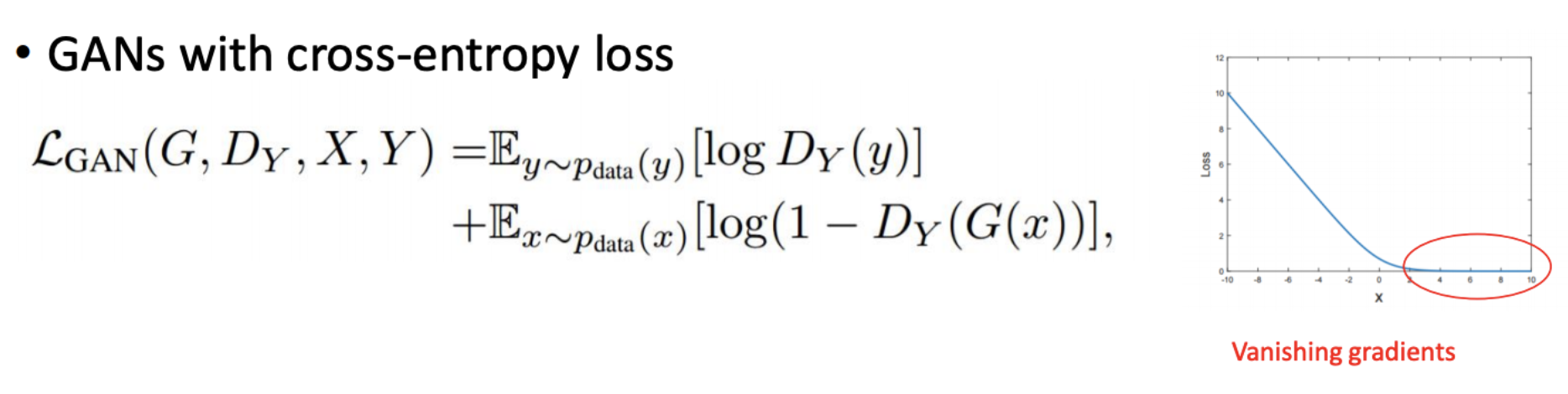 Gradient가 Flatten해지는 현상은 X가 Positive일 때 Flatten해져 loss가 0에 가까워집니다. 그로 인해 Vanishing gradients 현상이 발생되게 됩니다. 그래서 Adversarial loss만 사용하는 일반적인 GAN은 Training하기 어려워집니다.