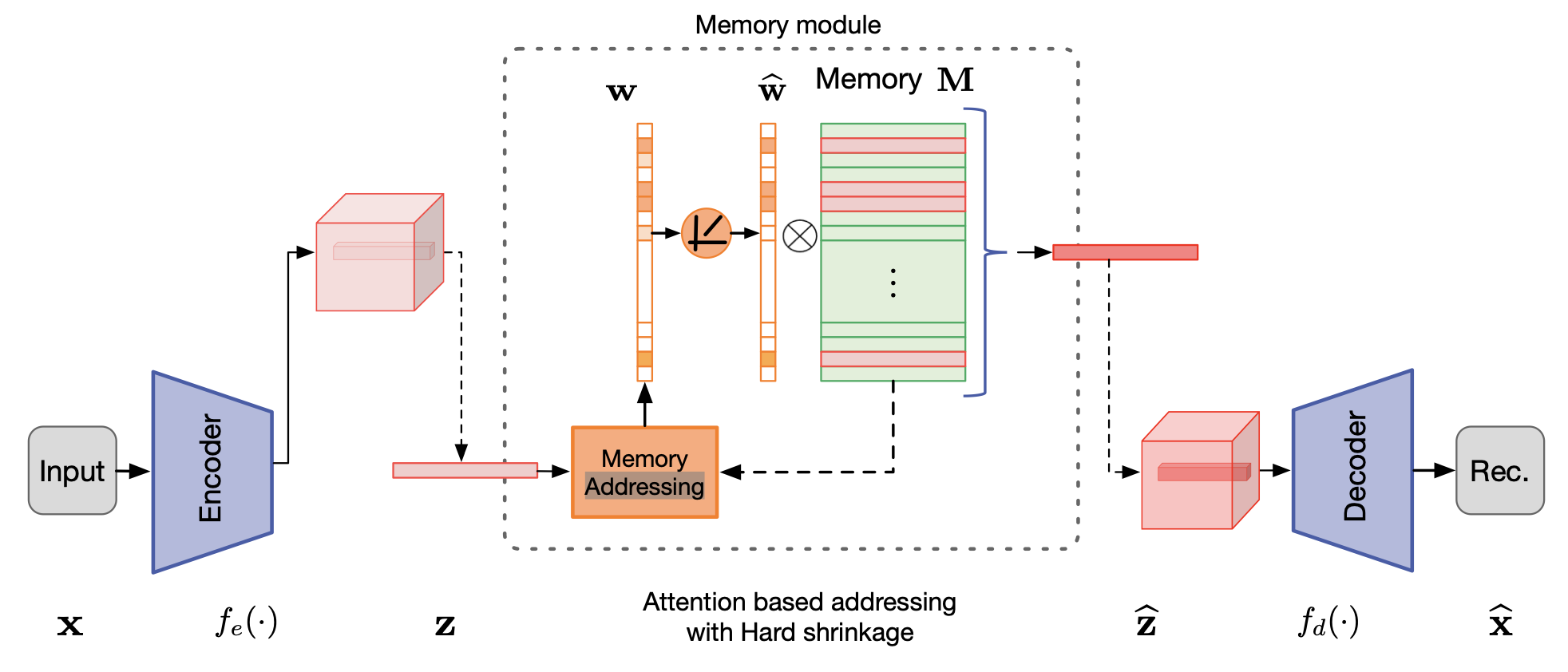 인코딩된 vector $\mathbf{z}$을 Decoder에 직접 전달하지 않고 (그림 1)와 같이 Memory module에서 입력 데이터를 기반으로 가장 관련성이 높은 메모리 항목을 검색한 후 $\mathbf{\hat{z}}$을 query로 사용하여 Decoder에 전달 합니다.