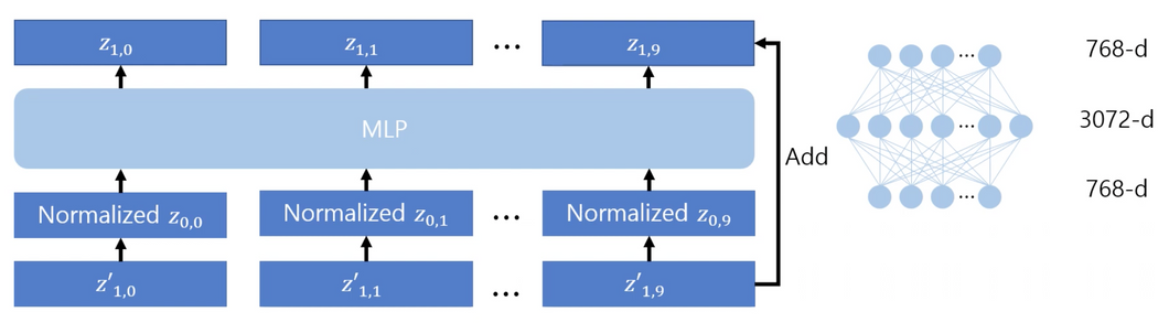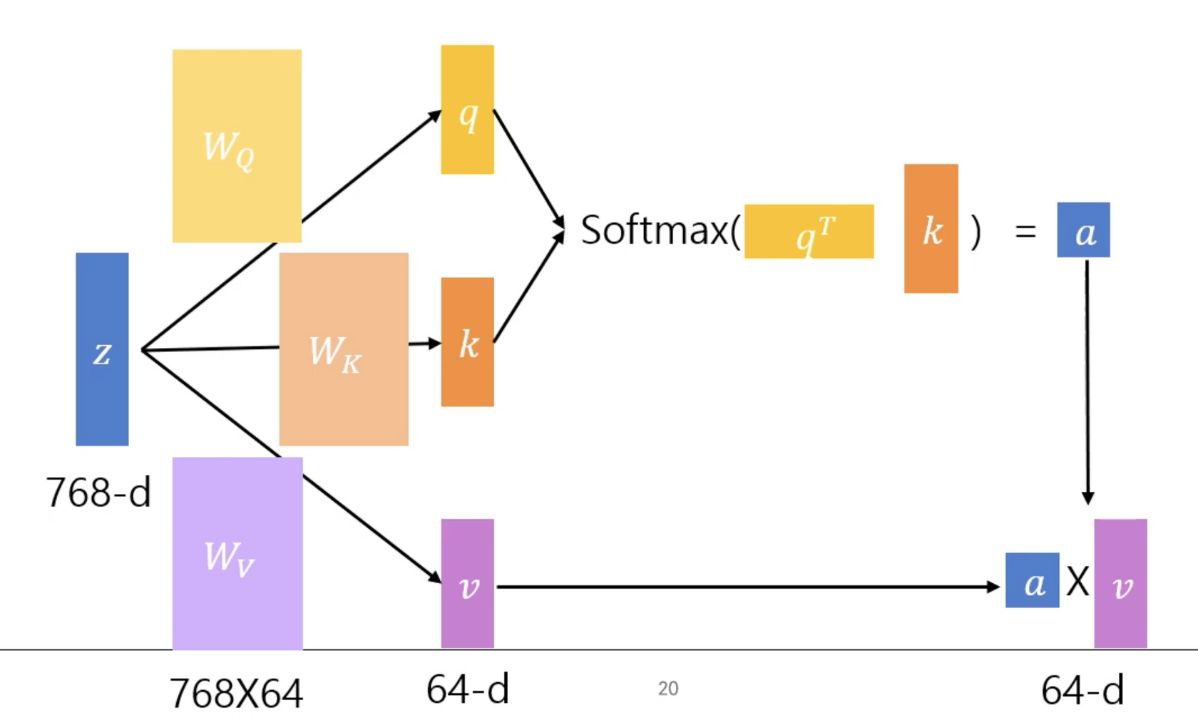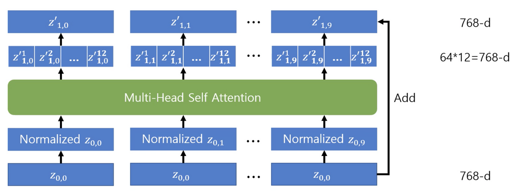 768차원 → Multi-head self-attention 통과 → 64차원으로 감소 → self-attention을 12번 수행하니 768차원으로 증가 → 결국 차원수가 동일하게 유지됨